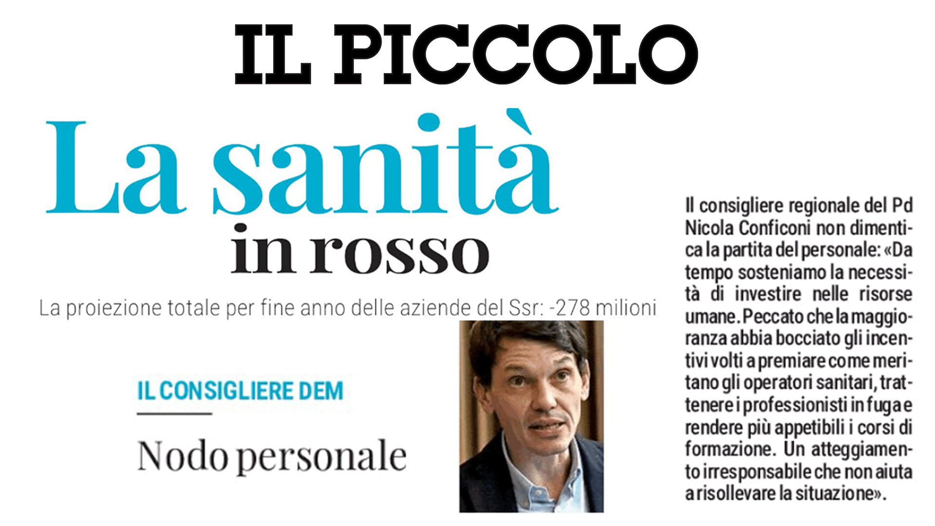 Trieste, 05.08.24 «Il buco di 278 milioni attesta il deficit di programmazione che penalizza la sanità regionale in difficoltà. Quel che è peggio è che i problemi dei cittadini restano, confermando la necessità di una svolta finora negata da una Giunta in sella da sei anni». Lo afferma il consigliere regionale Nicola Conficoni (Pd), commentando le risultanze del secondo rendiconto infrannuale.