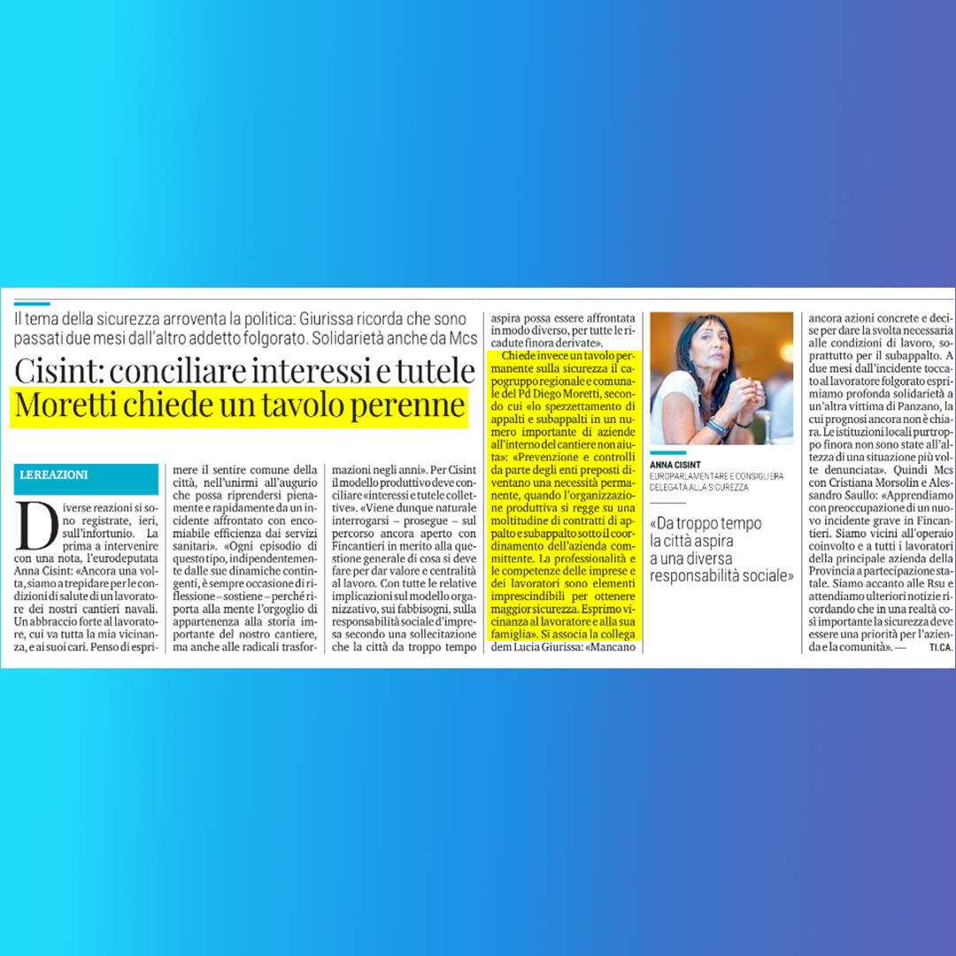 Monfalcone, 26.08.25 – «Prevenzione e controlli da parte degli enti preposti diventano una necessità permanente nel momento in cui l’organizzazione produttiva si regge su una moltitudine di contratti di appalto e subappalto, sotto il coordinamento dell’azienda committente. La professionalità e le competenze professionali delle aziende e dei lavoratori sono elementi imprescindibili per ottenere maggiore sicurezza. Esprimo vicinanza al lavoratore vittima dell’incidente e alla sua famiglia». Lo afferma il capogruppo del Pd in Consiglio regionale, Diego Moretti, riferendosi all’incidente che si è verificato questa mattina all’interno di un cantiere navale di Monfalcone, dove un operaio di un’impresa esterna, a bordo di una nave in consegna nello stabilimento di Fincantieri di Monfalcone (Gorizia) è caduto dall’alto riportando delle ferite.
