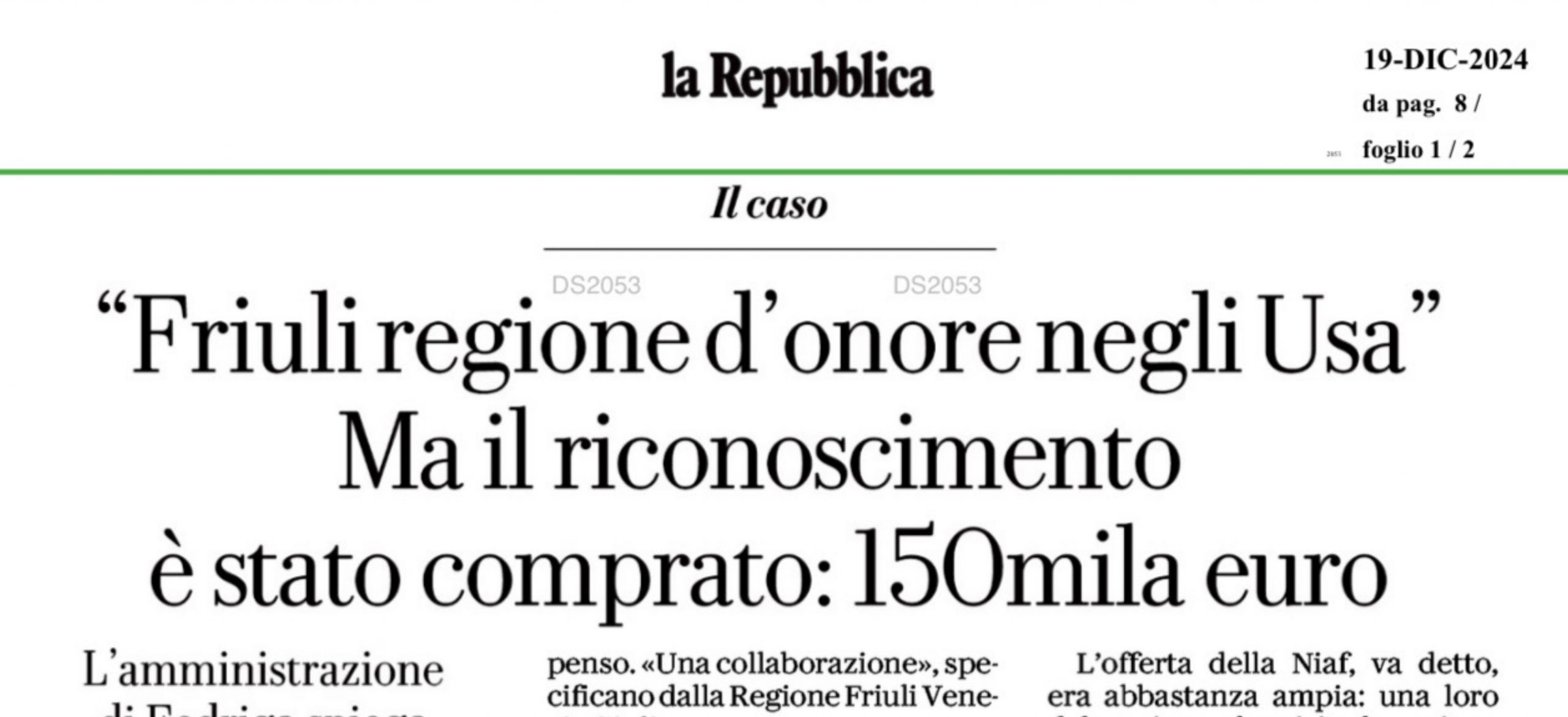 Trieste 19.12.24 – «Cene di gala in gran spolvero, serate festose, passerelle di vario tipo e, per finire, la fotografia con il presidente Usa Biden per festeggiare il riconoscimento del Fvg come regione 2024 negli Stati Uniti d’America. Tutto questo protagonismo, che il presidente Fedriga (e con lui l’assessore Bini) ha mostrato in ogni modo su social e media, non è altro che propaganda pagata con soldi pubblici e quindi dai cittadini. Oggi leggiamo che la Regione ha staccato un assegno da 150 mila euro per comprare il titolo di “Regione d’onore” e permettere questa montatura mediatica al presidente. E di questo ne chiederemo conto». Lo afferma il capogruppo del Pd in Consiglio regionale, Diego Moretti apprendendo la notizia diffusa oggi dal quotidiano “la Repubblica”.